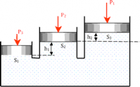 В системе трех поршней определить изменение сил P2 и P3. Площади поршней соответственно Sl, S2, S3, если h1 = 3,3 см; h2 = 2,2 см; Р1 = 1300 Н; S1 = 0,4 м2; S2 = 0,6 м2; S3 = 0,9 м2; ρ = 1000 кг/м3; g = 10 м/с2.