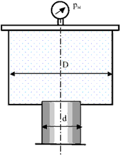 Главная » Учебные материалы » Механика жидкости и газа (МЖГ или Гидравлика) » Решения задач » Несколько классов/семестров » Рассчитать манометрическое давление pм и силу давления, действующую на верхнюю крышку сосуда, полностью заполненного водой, если вес сосуда G = 5 ⋅ 104 Н; диаметр сосуда D = 0,4 м; диаметр поршня, действующего на жидкость, d = 0,2 м.