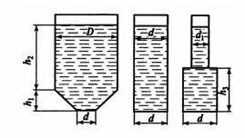 Определить силу давления на основание резервуаров, представленных на рис, а также силу реакции земли. Резервуары заполнены бензином одинаковой плотности. Весом резервуаров можно пренебречь. Исходные данные: d=1 м; d1=0,5 м; D=2 м; h1=1 м; h2=2 м; h3=1,5 м; ρ=700 кг/м3.