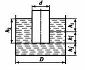 Свободная поверхность жидкости в резервуаре находится на расстоянии h'1+h'2 от его основания. После погружения цилиндра диаметром и расстояние до свободной поверхности стали равным h1+h'1+h'2. Определить диаметр d цилиндра, если h1=200 мм; h2=288 мм; D=60 мм. ![]()