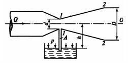 Горизонтальная часть эжектора расположена на высоте h=2 м от свободной поверхности жидкости в резервуаре. Диаметр горловины эжектора d=20 мм, а диаметр выходного сечения D=60 мм. Определить давление в минимальном сечении эжектора и максимальный расход при отсутствии расхода в трубке А.