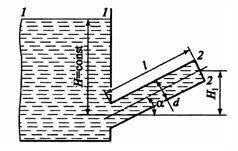 Жидкость с коэффициентом кинематической вязкости ν=0,1 см2/с течет по наклонному трубопроводу диаметром d=20 мм и длиной l=20 м под действием постоянного напора Н=1 м. Рассчитать минимальный угол наклона трубопровода α, при котором режим течения жидк