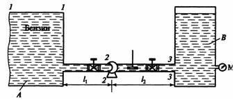 Центробежный насос транспортирует бензин из резервуара А в резервуар В. Уровень бензина в резервуаре А Н=20 м. Определить высоту всасывания насоса, высоту нагнетания и давление, измеряемое в выходном сечении насоса. Исходные данные: расход бензина Q=6,1310-3 м3/с, диаметр трубопровода d=0,05 м; ρ=810 кг/м3; ν=2,710-6 м2/с, коэффициенты потери напора на местные сопротивления: входа ξвх=0,5; крана ξкр=0,17; задвижки ξ=2; выхода ξвых=1; l1=6,5 м; l2=116 м.