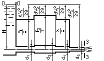 Главная » Учебные материалы » Механика жидкости и газа (МЖГ или Гидравлика) » Решения задач » Несколько классов/семестров » Определить расход воды в горизонтальном трубопроводе пере­менного сечения, скорость на каждом из участков и по­строить пьезометрическую линию, если H=5 м, d1=15 мм, d2=20 мм и d3=10 мм.