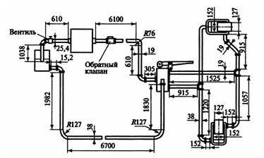 В гидравлической сети насос с подачей 37,8 л/мин поддерживает циркуляцию масла, имеющего вязкость 110 сСт при температуре 49 ºС и плотность ρ=880 кг/м3. Внутренние диаметры трубопроводов и их длины приведены н рис. Провести гидравлический расчет сети