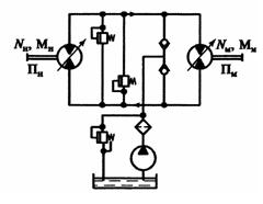 Для объемной гидропередачи технологической машины, гидравлическая схема которой изображена на риc., необходимо выбрать насос и гидромотор, если нагрузочный момент на валу Мg=5700 Н∙м, а скорость вращения должна изменяться в пределах 10...80 мин-1.
