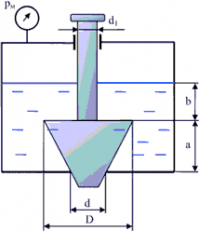 Отверстие в дне сосуда, содержащего масло с ρ=830 кг/м3, закрыто конической пробкой (с размерами: D=100 мм, d=50 мм, a=100 мм), укрепленной на штоке диаметром d1=25 мм. Уровень масла расположен выше пробки на расстоянии b=50 мм.