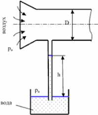 Определить весовой расход воздуха по трубе с плавно закругленным входом и цилиндрической частью диаметром D=200 мм, если показания вакуумметра в виде вертикальной стеклянной трубки, опущенной в сосуд с водой, h=250 мм.