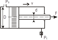 Определить диаметр отверстия дросселя, установленного на сливе гидроцилиндра, если под действием внешней нагрузки F=60 кН поршень движется со скоростью υ=200 мм/с. Диаметр штока d=40 мм, диаметр цилиндра D=80 мм, коэффициент расхода дросселя μ=0,65, плотность жидкости ρ=850 кг/м3, давление на сливе pс=0,3 МПа.