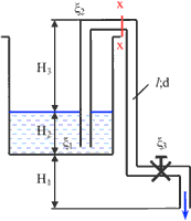 Определить расход воды через сифонный трубопровод, изображенный на рисунке, если высота H1 = 1 м; H2 = 2 м; H3 = 4 м. Общая длина трубы l = 20 м; диаметр d = 20 мм. Режим течения считать турбулентным. Учесть потери при входе в трубу ξ1 = 1; в коленах