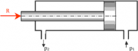 Определить давление масла p1, подводимого в поршневую полость гидроцилиндра, если избыточное в штоковой полости p2 = 80 кПа, усилие на штоке R = 10 кН, сила трения поршня о цилиндр F = 0,4 кН, диаметр поршня D = 125 мм, диаметр штока d = 70 мм.