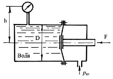 Главная » Учебные материалы » Механика жидкости и газа (МЖГ или Гидравлика) » Решения задач » Несколько классов/семестров » Номер 1 » Вариант 30 » Определить силу F, действующую на шток гибкой диафрагмы, если ее диаметр D=200 мм, показания вакуумметра рвак=0,05 МПа, высота h=1 м. Площадью штока пренебречь. Найти абсолютное давление в левой полости, если ha=740 мм. рт. ст.
