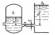 Вода перетекает из напорного бака, где избыточное давление воздуха р1=0,3 МПа, в открытый резервуар по короткой трубе диаметром d=50 мм, на которой установлен кран. Чему должен быть равен коэффициент сопротивления крана для того, чтобы расход воды составлял Q=8,7 л/с. Высоты уровней Н1=1м, Н2=3 м. Учесть потери напора на входе в трубу (ζвх=0,5) и на выходе из трубы (внезапное расширение).