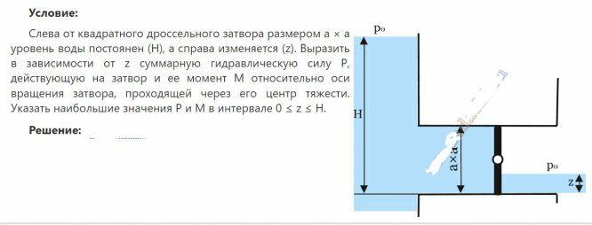 Слева от квадратного дроссельного затвора размером a × a уровень воды постоянен (H), а справа изменяется (z). Выразить в зависимости от z суммарную гидравлическую силу P, действующую на затвор и ее момент M относительно оси вращения затвора, проходящей через его центр тяжести. Указать наибольшие значения P и M в интервале 0 ≤ z ≤ H.