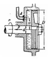Задача (Куколевский И.И.) 4-27. Гидравлическая пята, вращающаяся с числом оборотов n = 3000 об/мин, получает воду по трубке А под давлением р= 10 атм. Определить осевую силу Р, которую может уравновешивать пята, считая, что вода под поршнем вращается с половиной угловой скорости вращения последнего. Диаметр поршня D = 0,32 м, диаметр вала d = 0,05 м, трубка присоединена к корпусу пяты на расстоянии а = 0,07 м от оси. На каком расстоянии от оси нужно расположить трубку А, чтобы осевая сила, уравновешиваемая пятой, не зависела от оборотов?