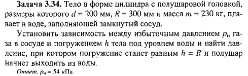 Тело в форме цилиндра с полушаровой головкой, размеры которого d=200 мм и масса m=230 кг плавает в воде, заполняющей замкнутый сосуд. Установить зависимость между избыточным давлением pи газа в сосуде...