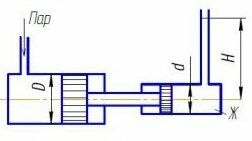 Паровой прямодействующий насос подает жидкость Ж на высоту Н. Каково абсолютное давление пара, если диаметр парового цилиндра D, а насосного цилиндра d? Потерями на трение пренебречь.