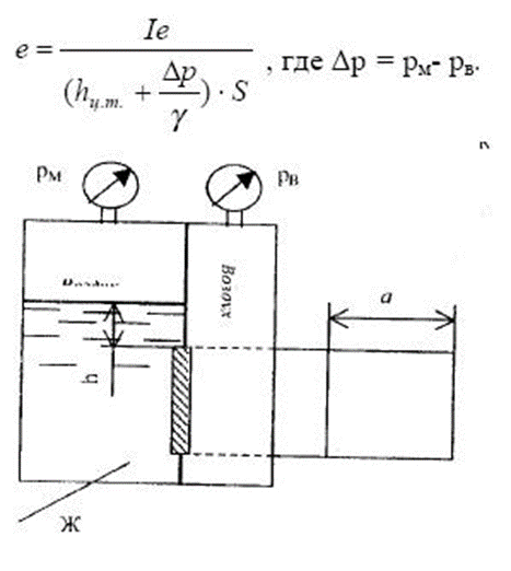 Замкнутый резервуар разделили на две части плоской перегородкой, имеющей квадратное отверстие со стороной α, закрытое крышкой. Давление над жидкостью Ж в левой части резервуара определяется показаниями манометра рм, давление воздуха в правой части - показания мановакуумметра. Определить величину и точку приложения результирующей силы давления на крышку. Указание. Эксцентриситет е центра давления для результирующей силы может быть определен по выражению