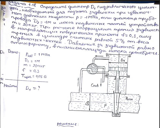 Определить диаметр D1 гидравлического цилиндра, необходимый для подъема задвижки, установленной на трубопроводе с избыточным давлением P = 1 МПа, если диаметр задвижки D2=1 м и вес подвижных частей устройства m = 204 кг. При расчете коэффициент трения задвижки в направляющих поверхностях принять равным f = 0,3, силу трения в цилиндре считать равной 5% от веса подвижных частей. Давление за задвижкой равно атмосферному.