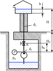 Вода с вязкостью ν = 0,02 Ст нагнетается насосом из колодца в водонапорную башню по вертикальному трубопроводу. Определить диаметр трубы от крана К до бака d2, если высота башни H = 10 м; глубина погружения насоса H0 = 5 м; высота уровня жидкости в б