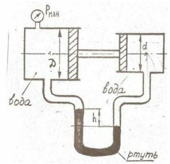 Определить показание дифференциального ртутного манометра (h). Поршни находятся в состоянии равновесия. pман = 80 кПа; D = 20 мм; d = 15 мм; ρрт/ρв = 13,6.