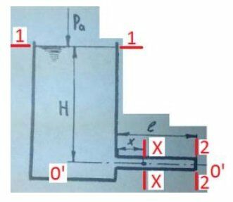 Расход воды, вытекающий из бака под напором H=6,0 м, по трубе диаметром d=150 мм и длиной l=4 м, равен Q=130 л/с. Определить, учитывая путевые и местные потери, на каком расстоянии X от входа в трубу избыточное давление в точке, находящейся на оси трубы, равно p=9,81 кПа. Принимать коэффициент сопротивления на вход равным ζвх=0,5. ![]()