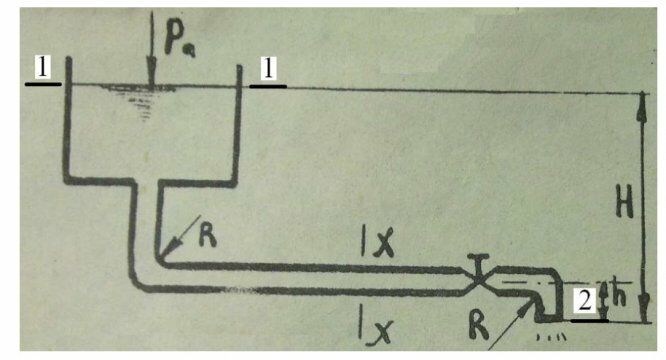 Из резервуара вода в количестве Q=80 л/с вытекает в атмосферу по трубопроводу диаметром d=100 мм и длиной l=60 м. Определить напор H и давление в центре сечения X–X, находящегося на расстоянии lx=30 м от входа и на высоте h=3 м от выхода из трубопровода, если величина эквивалентной шероховатости Δэ=1,2 мм, вход с острыми краями, коэффициенты сопротивлений закругления ζзак=0,37, задвижки ζзадв=0,8, ζвх=0,5. ![]()