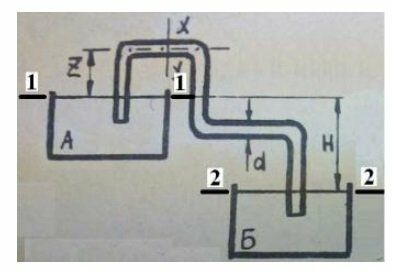 По сифонному трубопроводу длиной L=32 м при постоянном напоре Н=4,6 м вода сливается из бака А в бак Б. Определить расход, если диаметр трубопровода d=100 мм, и вакуум в сечении X–X, расположенном на расстоянии lх=8,0 м от входного сечения и поднятом