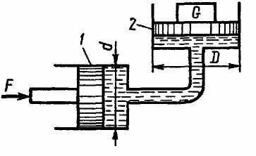 Главная » Учебные материалы » Механика жидкости и газа (МЖГ или Гидравлика) » Решения задач » Несколько классов/семестров » Номер 1 » Вариант 16 » Определить давление в гидросистеме и вес груза G, лежащего на поршне 2, если для его подъема к поршню 1 приложена сила F=1кН. Диаметры поршней: D = 300 мм, d = 80 мм. Разностью высот пренебречь.