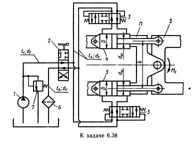 Трактор имеет механизм поворота, состоящий из шарнирно сочлененных передней П и задней 3 полурам, а также гидропривода поворота, упрощенная схема которого приведена на рисунке. Рабочая жидкость подается насосом 1 через трехпозиционный распределитель 2 и клапанные коробки 3 в гидроцилиндры 4 и 5. Гидравлическая система имеет также фильтр 6 и предохранительный клапан 7. При положении распределителя, изображенном на рисунке, в правую полость гидроцилиндра 4 от насоса поступает жидкость, а левая полость соединена со сливным трубопроводом и шток гидроцилиндра 4 движется влево. Шток гидроцилиндра 5 при этом движется вправо. Таким образом осуществляется поворот трактора. Определить мощность, потребляемую насосом, если к. п. д. 0,7; момент сопротивления повороту Мс = 125 Н*м. Задачу решить при b = 0,5 м; l1 = 1,4 м; l2 = 1,2 м; l3=1 м; D = 90 мм; dш = 40 мм; dт=12 мм; V = 0,5 Ст; р = 900 кг/м3; рабочий объем насоса V = 46 см3; частота вращения насоса n = 1800 об/мин; объемннй к. п. д. = 0,85 при Рн = 3 МПа; зквивалентная длина для распределителя lp = 200 dт; для фильтра lф = 400 dт. Коэффициент сопротивления клапанной коробки ξ = 15.