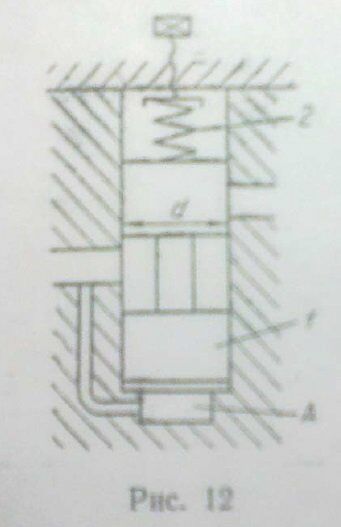 На рис. 12 показана схема гидроклапана с золотником диаметром d =20 мм. Пренебрегая трением в гидроклапане и весом золотника 1, определить минимальное усилие, которое должна развивать сжатая пружина 2 для уравновешивания в нижней полости А давления