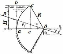 Определить силу суммарного давления на секторный затвор и ее направление. Глубина воды перед затвором H = 4 м, длина затвора L = 8 м, угол α = 60°. ![]()