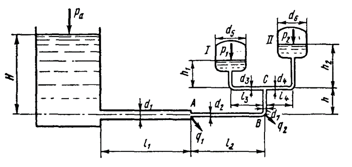 Главная » Учебные материалы » Механика жидкости и газа (МЖГ или Гидравлика) » Решения задач » Определить напор Н питающего резервуара с водой и расходы в разветвлениях Q3 и Q4, если заданы давления на поверхности в резервуарах Р1 = РИЗБ = 0,2 ат, Р2 = РВАК = 0,2 ат, общий расход Q = 15 л/с, расход в узле А q1 = 5 л/c, коэффициент шероховатост