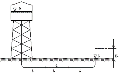 Известно, что dy=100 мм, l1= 250 м, l2= 280 м, l3=300 м, zп=115 м, Нсв=20 м. Определить требуемую отметку zб при подаче расхода Q=10 л/с, использу“удельное сопротивление трубы”.