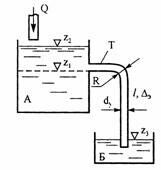 В резервуар А поступает вода (ν=0,01 Ст), расход которой изменяется от 0 до Q. Уровень воды в резервуаре не должен быть ниже отметки z1 и выше отметки z2. Для выполнения этих условий резервуар А оборудован стальной электросварной умеренно корродированной переливной трубой Т диаметром dу, длиной l, имеющей один поворот на 90° радиусом R. Переливная труба перепускает излишки воды в резервуар Б, уровень в котором находится на отметке z3.
