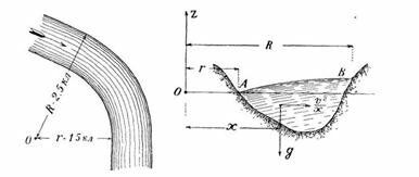 Река шириною в 1 км/ч. течет по закруглению (рис. 21) со скоростью V=6 км/ч Предполагая, что скорости всех частиц воды в одном и том же сечении равны геометрически и пренебрегая вращением земли, определить превышение внешнего берега над внутренним.