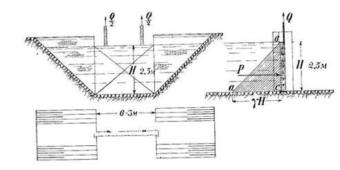 Плоский прямоугольный водоудержательный шит перегораживает канал шириною b=3 м; глубина воды в канале Н=2,5 м. Определить давление воды на щит и усилие, необходимое для подъема щита, если вес щита G=1 т. и коэффициент трения f=0,50 (рис. 31).