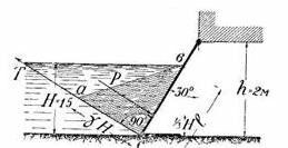 Главная » Учебные материалы » Механика жидкости и газа (МЖГ или Гидравлика) » Решения задач » Несколько классов/семестров » Номер 25 » Канал шириною b=2 м. перегораживается плоским прямоугольным наклонным щитом. Определить, пренебрегая весом щита и трением в шарнире, силу тяги Т, если глубина воды в канале Н=1,50 м и угол наклона щита α=30°. Считать, что сила тяги действует по перпе
