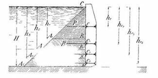 Плоский металлический щит (щит Stоney'я) имеет размеры: ширина b=5 м. и высота Н=4 м. С одной стороны вода стоит в уровень с верхней кромкой щита, с другой - воды нет. Остов шита предполагается составить из четырех горизонтальных одинаковых ферм. Найти расположение ферм из того условия, чтобы все они были одинаково нагружены (рис. 37).