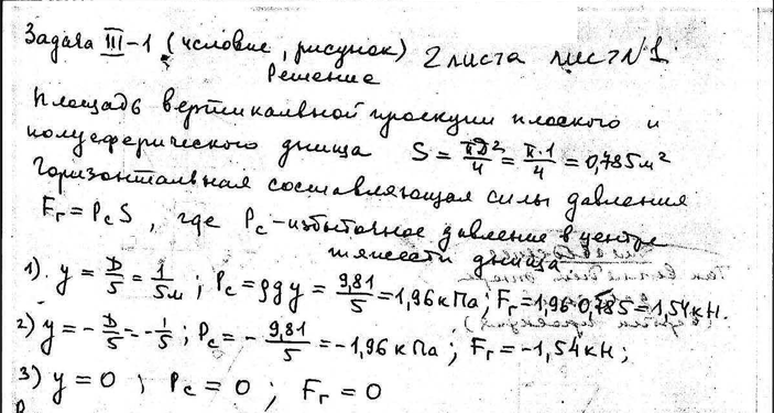 Ответы: Горизонтальные составляющие сил давления на правое и левое днища одинаковы и равны + 1,54 кН; - 1,54 кН и 0; вертикальные составляющие сил давления на полусферу одинаковы для трех случаев и равны 2,57 кН.