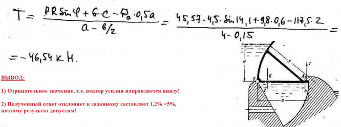 Секторный затвор плотины радиусом R = 4,5 м поддерживает напор воды Н = 3м. Поворачиваясь вокруг оси О, затвор может погружаться в выемку, сделанную в теле плотины и заполненную водой. Пренебрегая трением в опорах вращения, определить усилие Т, с которым затвор прижимается к уступу А плотины (приходящееся на 1 м, длины затвора), если масса 1 пог. м затвора 1т, размеры а = 4м и b= 0,3 ми расстояние с = 0,6 м. Ответ. Т = 47,1 кН..