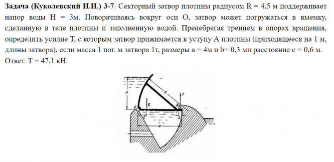 Показать/скрыть дополнительное описаниеСекторный затвор плотины радиусом R = 4,5 м поддерживает напор воды Н = 3м. Поворачиваясь вокруг оси О, затвор может погружаться в выемку, сделанную в теле плотины и заполненную водой. Пренебрегая трением в опорах вращения, определить усилие Т, с которым затвор прижимается к уступу А плотины (приходящееся на 1 м, длины затвора), если масса 1 пог. м затвора 1т, размеры а = 4м и b= 0,3 ми расстояние с = 0,6 м. Ответ. Т = 47,1 кН..