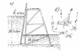 Главная » Учебные материалы » Механика жидкости и газа (МЖГ или Гидравлика) » Решения задач » Несколько классов/семестров » Номер 30 » Рассчитать спицу для плотины системы Роireе, если глубина воды в верхнем бьефе Н1=2,20 м, глубина воды в нижнем бьефе Н2=0,50 м, расстояние от порога флютбета до опорной балки (по вертикали) 2,50 м. и спица составляет с вертикалью угол α=8' (рис. 40)
