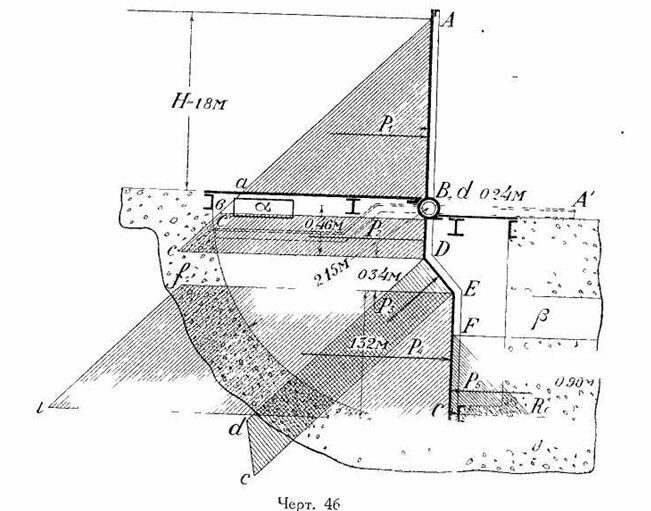 Плотина Desfontaines`a (черт. 46) состоит из щита АВ и контр-щита ВС, составляющего со щитом одно целое тело, вращающееся вокруг горизонтальной оси В. Контр-щит помещен в камере, образованной в массиве флютбета. Камера эта делится контр-щитом на две части, при чем каждая из этих частей порознь может с помощью особого распределительного устройства соединяться через каналы α и β либо с верхним бьефом, либо – с нижним. Так, если щит опущен (см. пунктир A`BC`), то, соединяя левую камеру с верхним бьефом, а правую – с нижним, мы будем поднимать щит и наоборот, при поднятом щите, если соединить правую камеру с верхним бьефом, а левую – с нижним, мы будем поднимать щит.