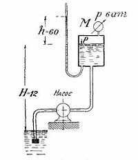 Определить мощность насоса, поднимающего воду в резервуар, расположенный на высоте Н=12 м, если количество подаваемой воды Q=160 л/с, манометрическое давление в резервуаре P=6 атм. и коэффициент полезного действия насоса 80% (рис. 61).