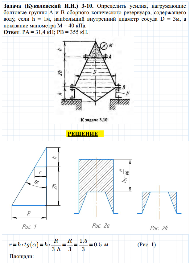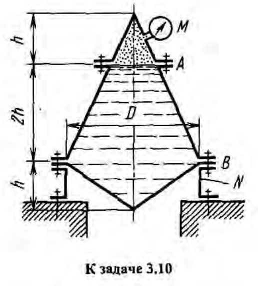 Определить усилия, нагружающие болтовые группы А и В сборного конического резервуара, содержащего воду, если h = 1м, наибольший внутренний диаметр сосуда D = 3м, а показание манометра М = 40 кПа.Ответ. РA = 31,4 кН; РB = 355 кН.