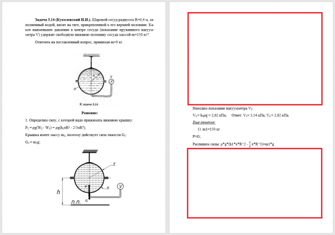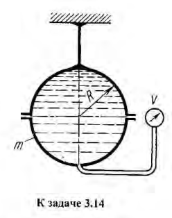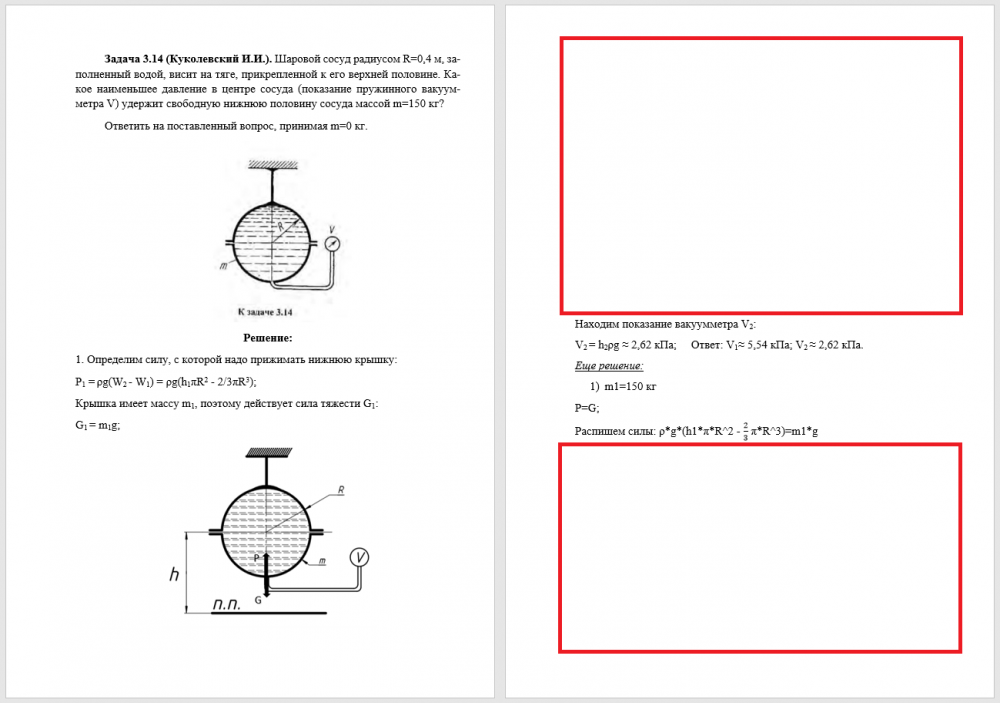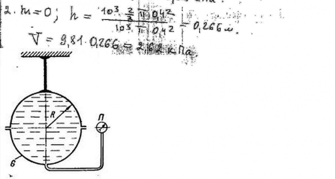 Шаровой сосуд радиусом R=0,4 м, заполненный водой, висит на тяге, прикрепленной к его верхней половине. Какое наименьшее давление в центре сосуда (показание пружинного мановакуумметра П) удержит свободную нижнюю половину сосуда весом m=150кг? Ответить на поставленный вопрос, считая сосуд невесомым. Ответ. Разрежение в центре: V1=5,55 кПа; V2= 2,62 кПа..
