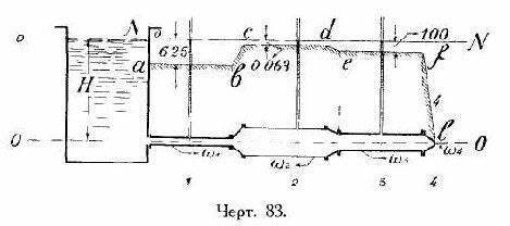 На рис. 83 изображена система, состоящая из резервуара и трубы переменного сечения, оканчивающейся конически сходящейся короткой трубкой. Пренебрегая сопротивлениями, определить скорость истечения, расход и построить пьезометрическую линию. Дано: напор Н=25 м = const; площади сечений трубы ω1=0,4 дм2, ω2=4 дм2, ω3=1 дм2, ω4=0,2 дм2.