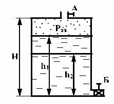 Главная » Учебные материалы » Механика жидкости и газа (МЖГ или Гидравлика) » Решения задач » Несколько классов/семестров » В цилиндрический сосуд при за­крытом кране Б и открытом кране А наливается ртуть при атмосферном давлении до высоты h1 = 50 см. Высота сосуда H = 70 см. Затем кран А закрывается, а кран Б открывается. Ртуть начи­нает вытекать из сосуда в атмосферу. П