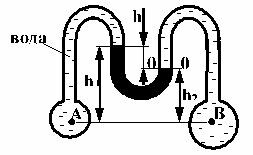 Определить при помощи дифференциального манометра разность давлений в точках В и А двух трубопроводов, заполненных водой. Высота столба ртути h1-h2=h=20 см. Удельный вес ртути gрт=133416 Н/м3, воды g= 9810 Н/м3.